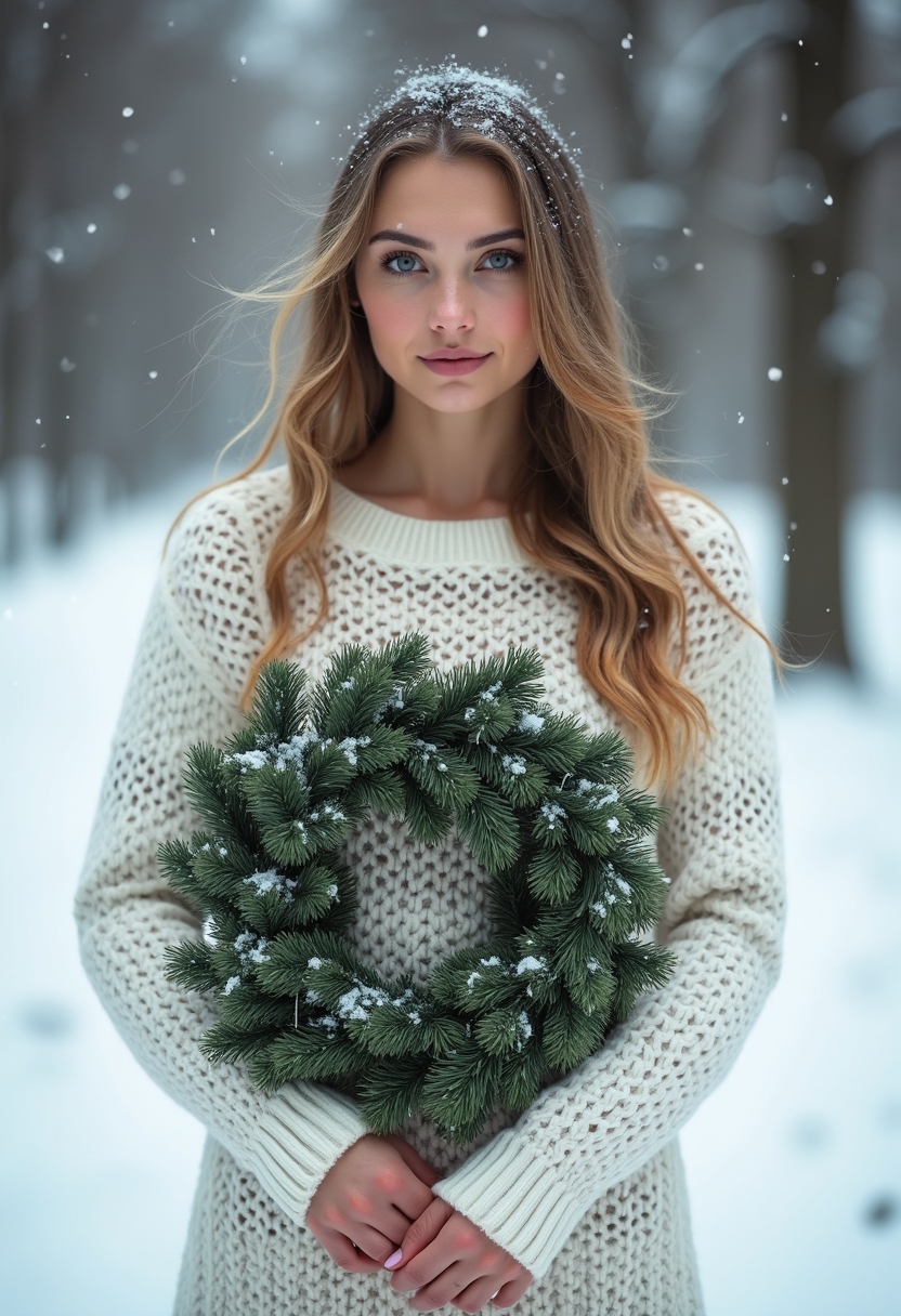 Женщина в белом свитере с снежинками стоит в заснеженном парке, держит венок в руках, смотрит прямо в камеру