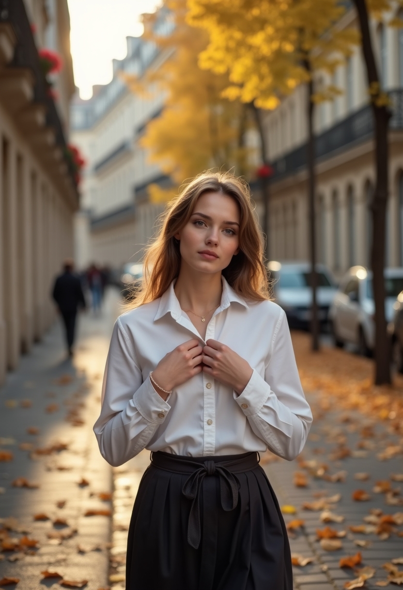 Женщина в белоснежной рубашке, заправленной в тёмную юбку, идёт по улице, усыпанной осенними листьями. Её руки сложены на груди, а лицо подсвечено утренним солнцем. Позади старинные французские дома с балконами, украшенными цветами. Крупный план, создающий тёплую атмосферу осени в Париже.