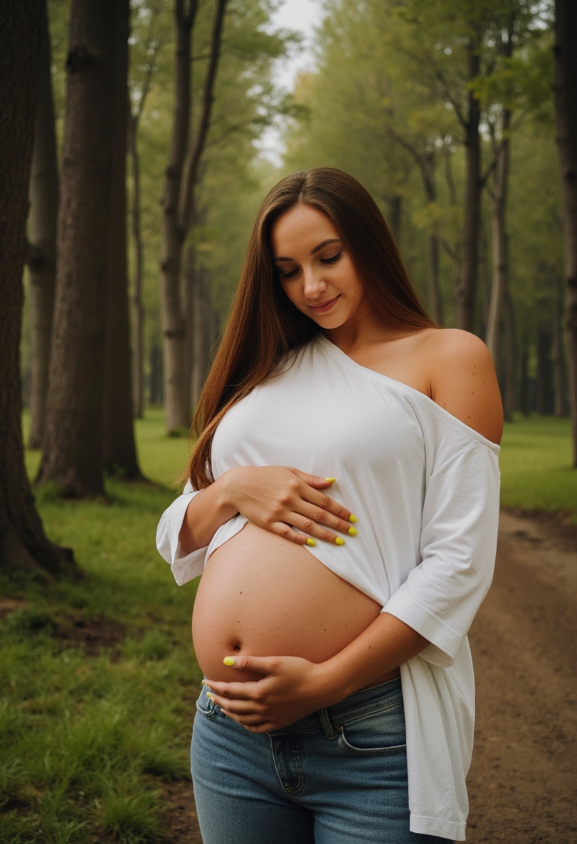Примерить образ на себеЖенщина в белой блузке и джинсах стоит на лесной тропинке, окружённая деревьями, руки ласково обнимают её живот