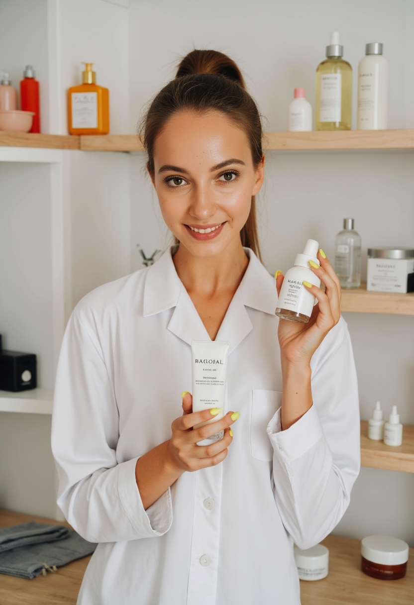 Молодая женщина-косметолог в белом медицинском халате, стоит на фоне чистой современной клиники, держит инструменты для ухода за кожей, уверенно смотрит в камеру, светлая атмосфера.