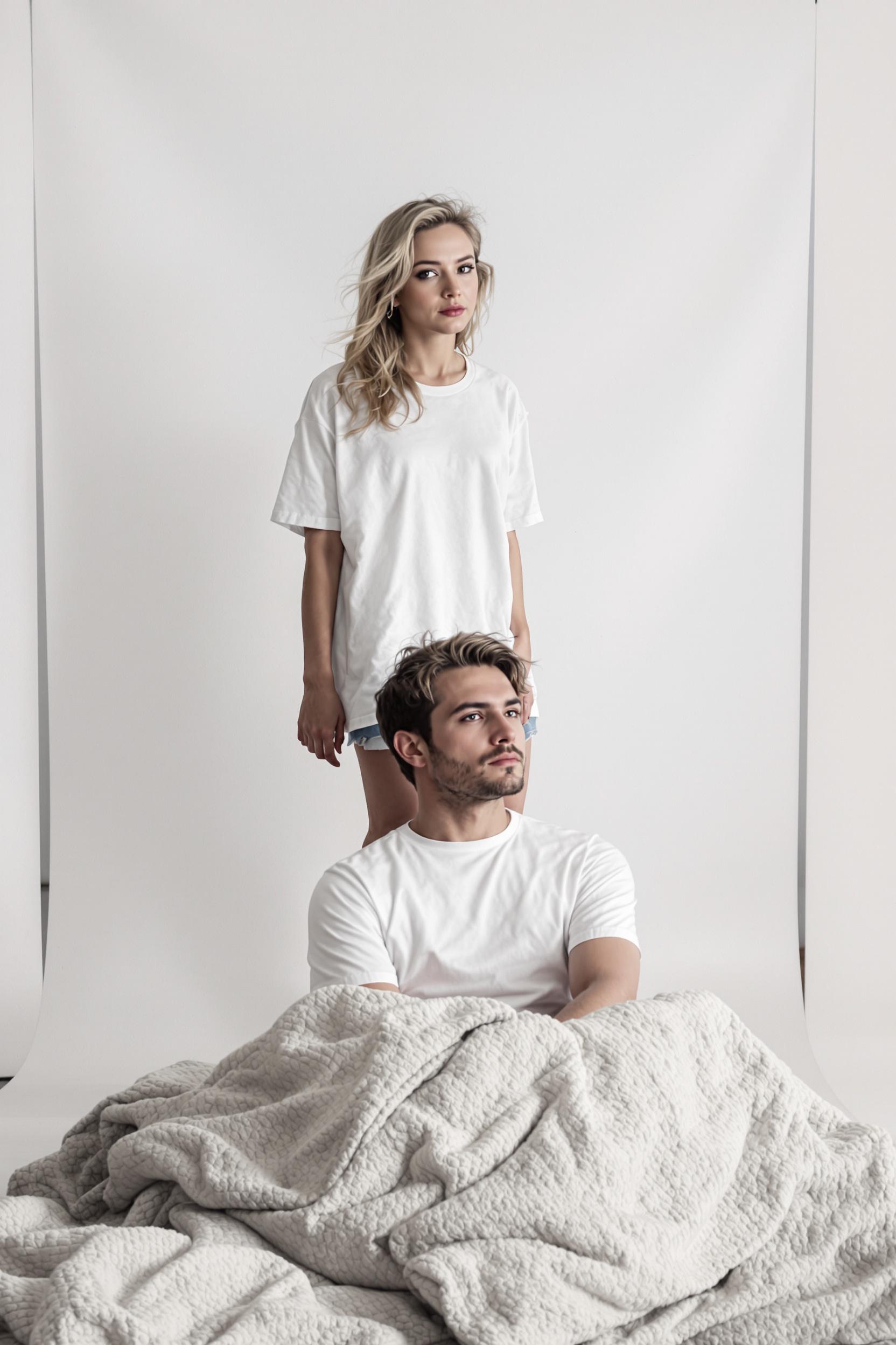 Женщина в белой футболке стоит на фоне белой циклорамы, у её ног лежит свёрнутый плед. Парень сидит спиной к камере, облокотившись на пол, его лицо скрыто. Она смотрит прямо в камеру уверенно, акцент на минимализме и женском образе.