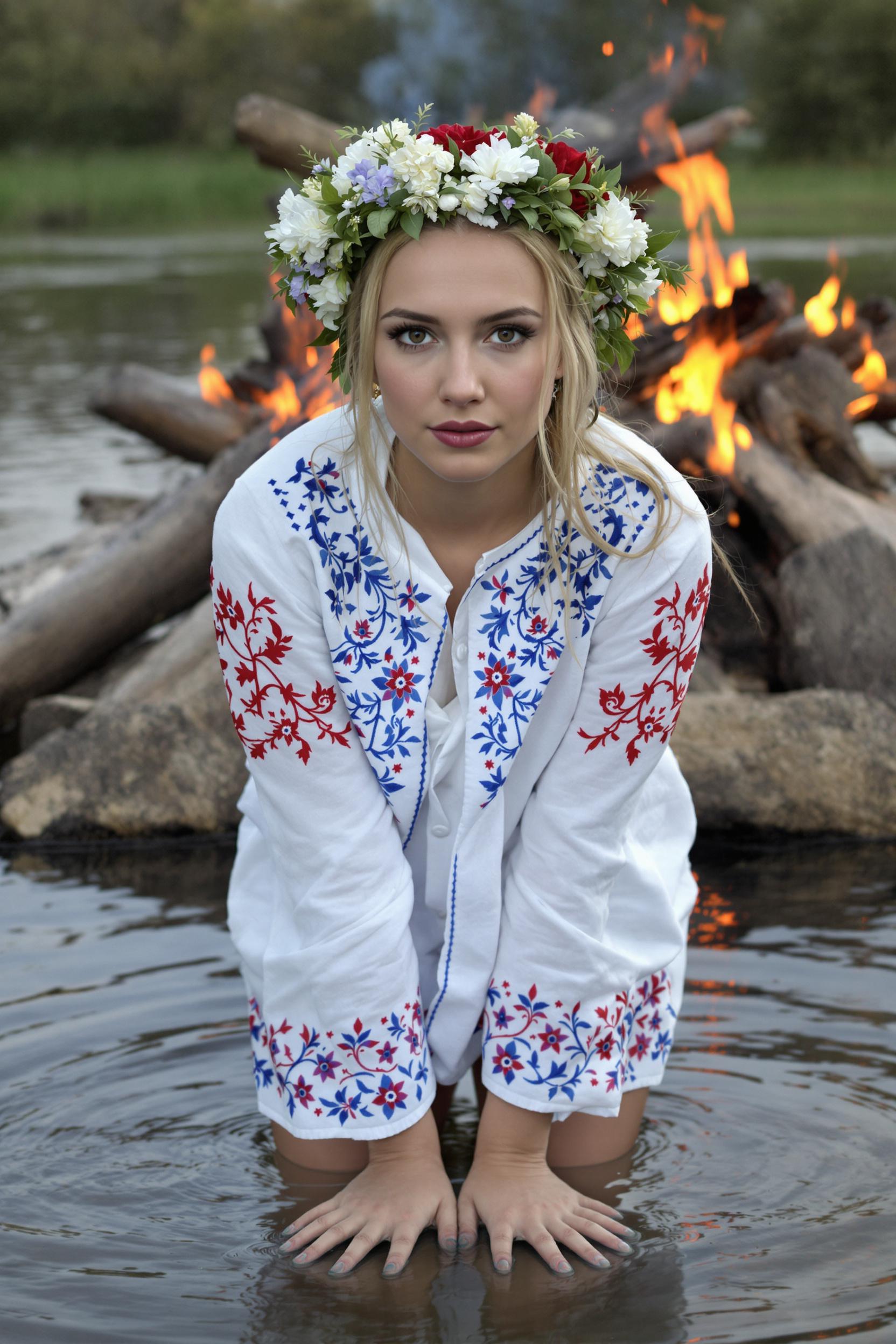 Женщина в белой хлопковой рубахе, украшенной синими и красными вышивками по вороту и рукавам, стоит по щиколотку в воде на фоне костра. Венок из свежих луговых цветов венчает её волосы. Она наклонена вперёд, руки опираются на колени, пристально смотрит в камеру.