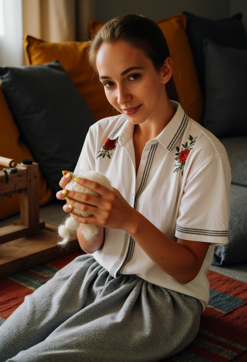 Женщина в белой рубашке с цветочным узором и шерстяной юбке сидит у прялки, держит шерсть, смотрит прямо в камеру