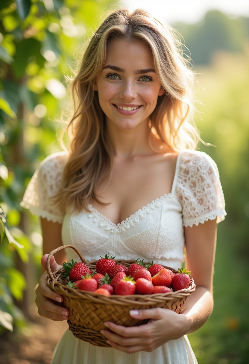 Женщина в белой юбке и коротком топе держит в руках корзину с клубникой, её пальцы аккуратно перебирают ягоды. Она улыбается, глядя в камеру, а позади размытые поля и солнечные лучи пробиваются сквозь листву. Крупный план, подчёркивающий свежесть и летнюю лёгкость.