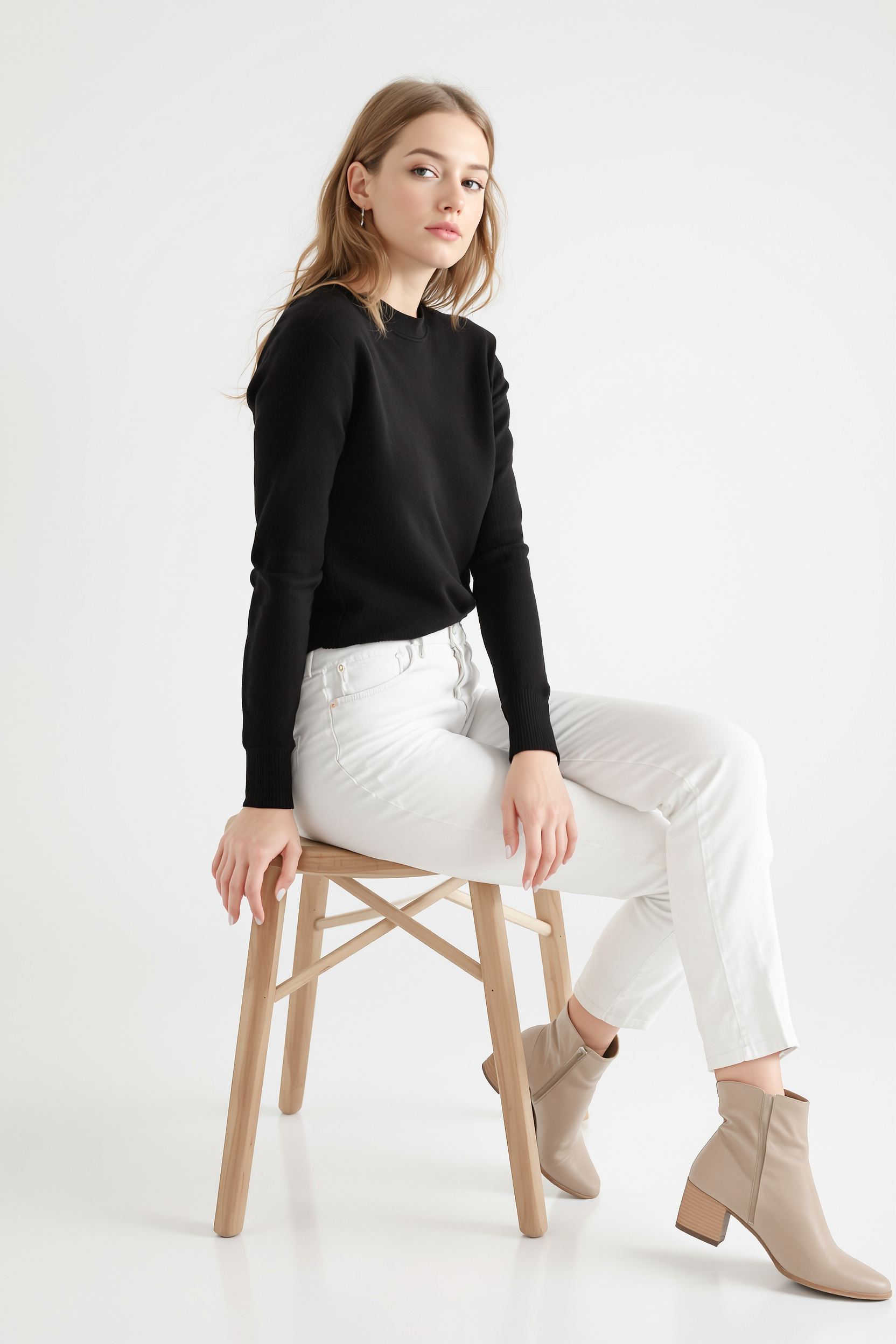 Женщина в белых джинсах прямого кроя и минималистичном черном трикотажном топе с длинными рукавами. На ней нейтральные кожаные ботинки на плоской подошве. Она сидит на деревянном стуле боком к камере, одна рука лежит на спинке стула, уверенный взгляд направлен прямо в объектив. Чистый, светлый студийный фон.