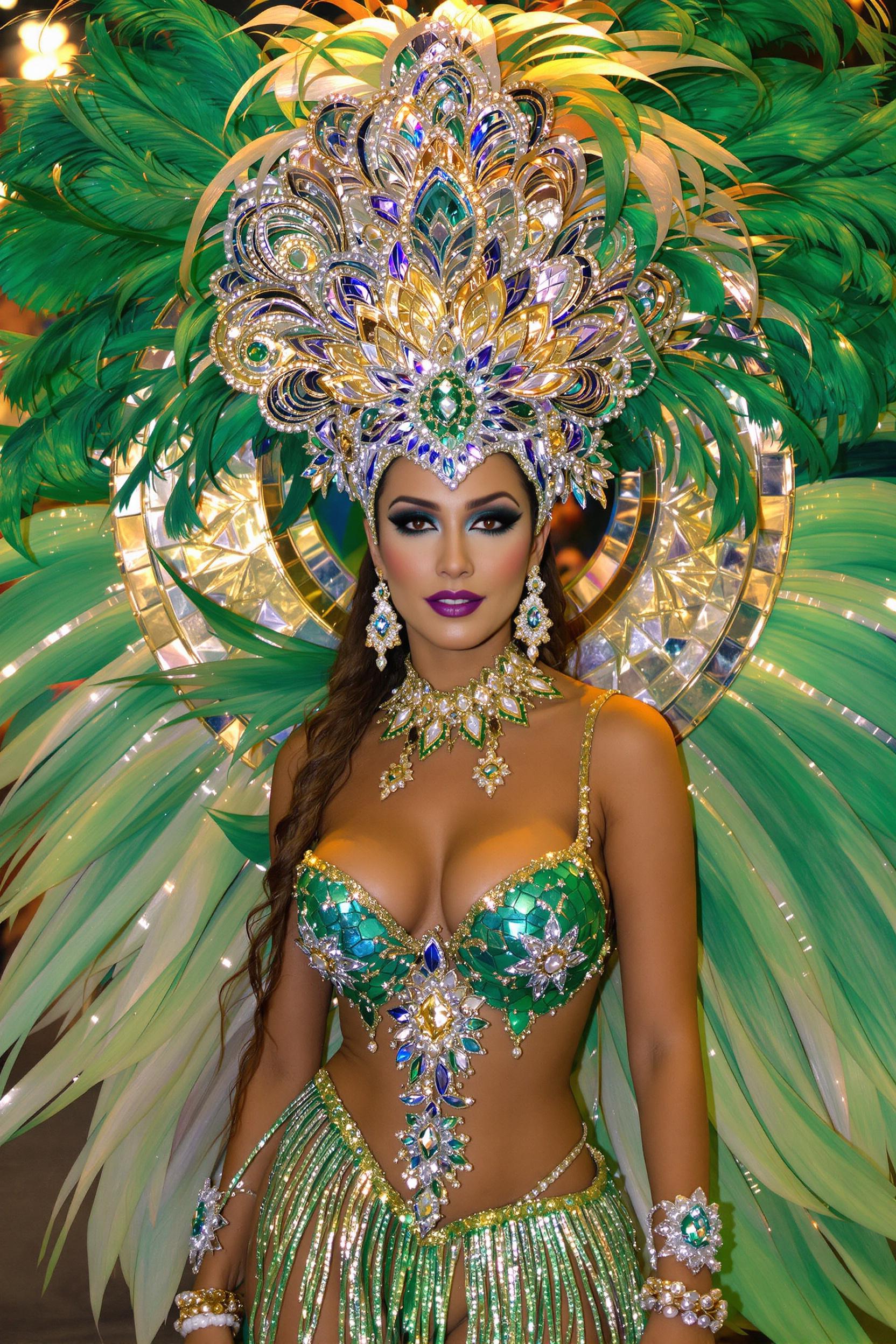 Женщина в блестящем карнавальном ансамбле: лиф, вышитый зелёными и синими пайетками, короткая юбка с переливчатой бахромой, массивный головной убор с изумрудными перьями, сверкающие серьги и браслеты, средний план, взгляд в камеру, фон фейерверков и танцев Рио.