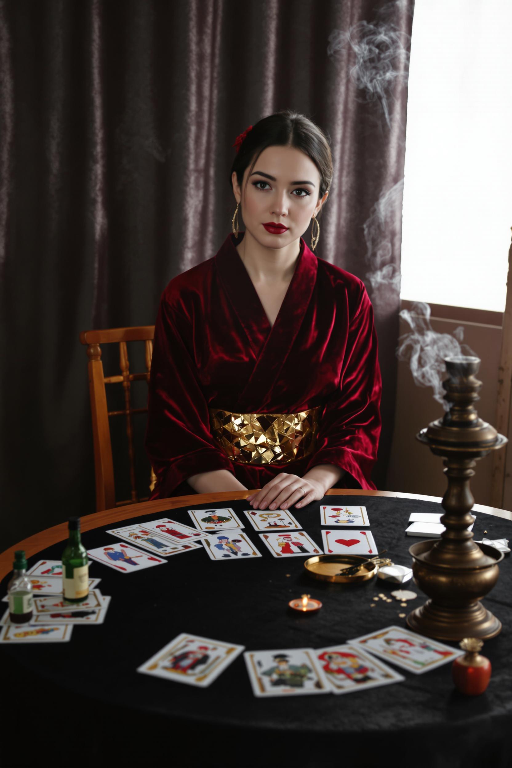 Примерить образ на себеЖенщина в бордовом бархатном кимоно с золотым поясом сидит за круглым деревянным столом, устланным черной скатертью. Перед ней разложены карты Таро и стоит дымящийся аромалампа. Женщина внимательно смотрит в камеру, фон наполнен загадочностью.