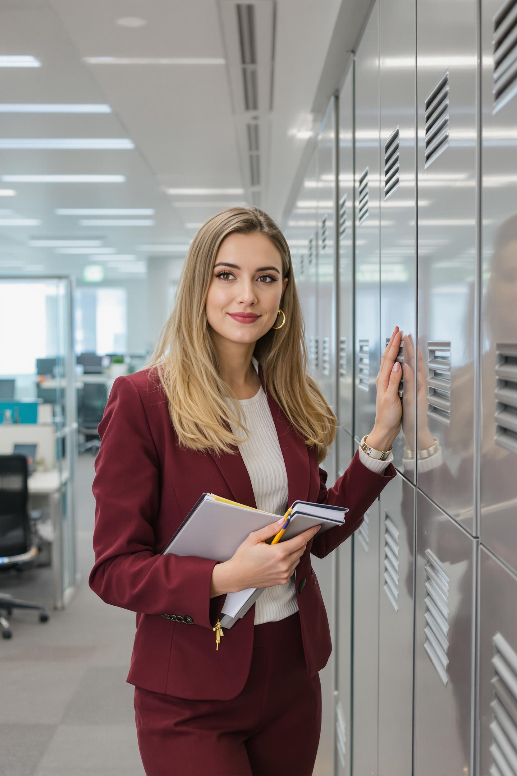 Женщина в бордовом деловом костюме стоит у офисного шкафчика с карандашом и блокнотом в руках. Она уверенно смотрит в камеру, на заднем плане — аккуратные рабочие места, стеклянные перегородки, современный светлый офис. Крупный план.