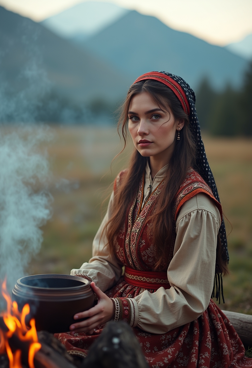 Женщина в бурятском национальном платье с поясом и головным платком сидит у тлеющего костра, в руках держит чашу. Она смотрит в камеру спокойно, позади — горы и дым. Крупный план, образ тепла и традиции.