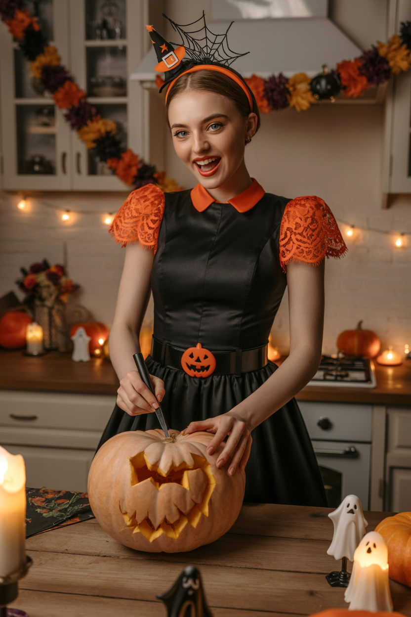 Женщина в центре декорированной кухни с хэллоуинскими гирляндами, одета в приталенное черное платье с оранжевым кружевом и длинными рукавами, на талии широкий пояс с пряжкой в виде тыквы, на голове обруч с черной паутиной и мини-ведьминской шляпкой, она склонилась над столом, аккуратно вырезая узор на тыкве, и с энтузиазмом смотрит в камеру, вокруг расставлены свечи и фигурки привидений.