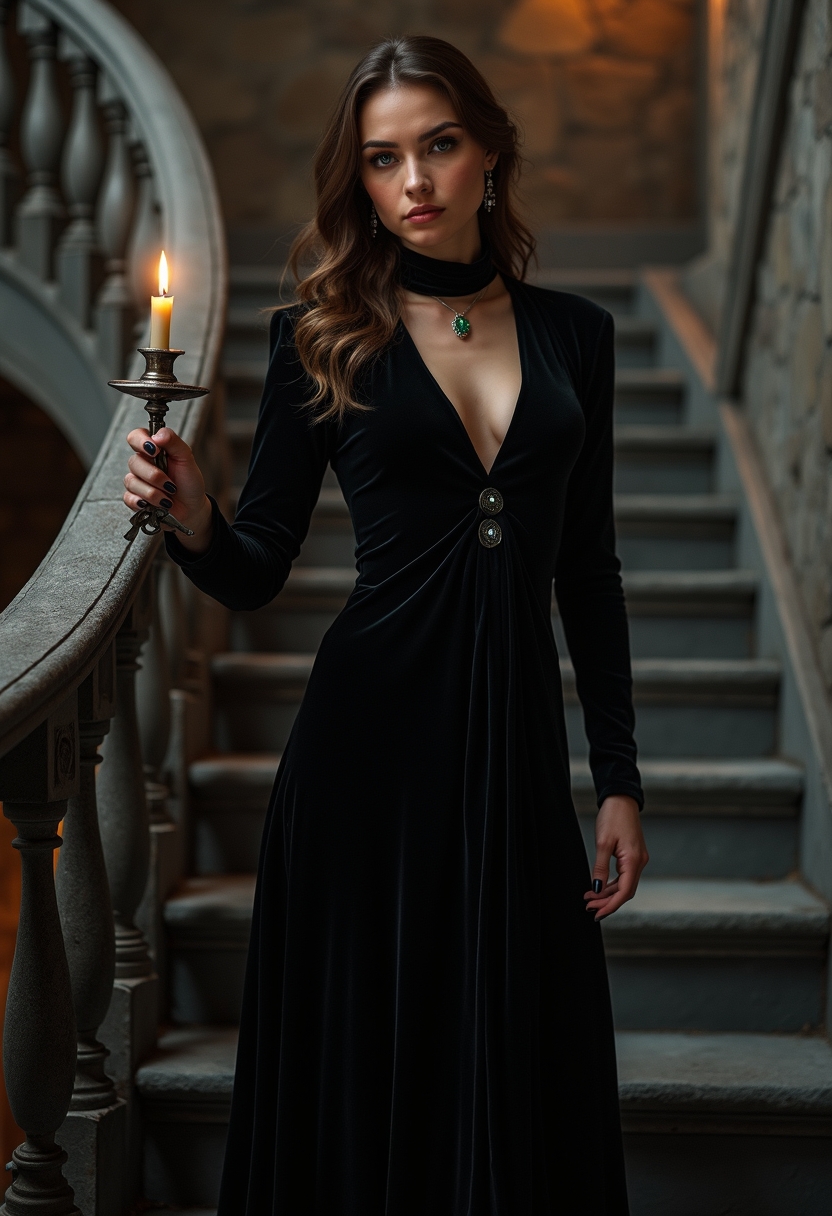 Женщина в чёрном бархатном платье с высоким воротником и кольцом с изумрудом стоит на лестнице из тёмного камня, украшенной коваными перилами. В одной руке она держит свечу в серебряном подсвечнике. Её взгляд строгий и направлен вниз. Освещение тёмное, акцент на её аксессуарах и архитектуре замка.