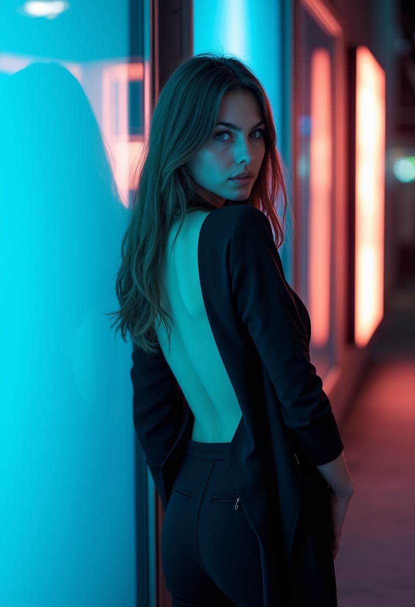 Женщина в чёрном брючном костюме с открытой спиной стоит у рекламного щита, подсвеченного синим неоновым светом. Она смотрит прямо в камеру, слегка повернув голову. Позади видны отражения света на металлических поверхностях. Освещение яркое, акцент на её уверенности.