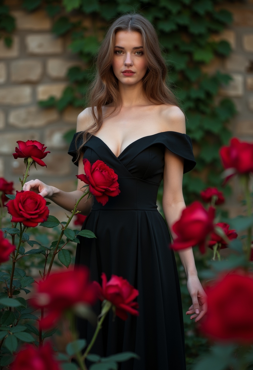 Женщина в чёрном элегантном платье с открытыми плечами стоит среди гигантских алых роз, её руки касаются лепестков. Фон — старинная каменная стена, частично скрытая зелёными лозами. Освещение контрастное, создающее эффект романтической драмы.