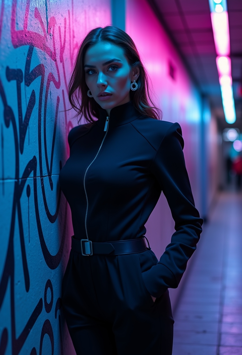 Женщина в чёрном комбинезоне с высокими воротником стоит у стены метро, освещённой синим и фиолетовым неоновым светом. Она смотрит прямо в камеру с серьёзным выражением лица. Позади виден граффити на стене. Освещение неоновое, акцент на её контрастном образе.