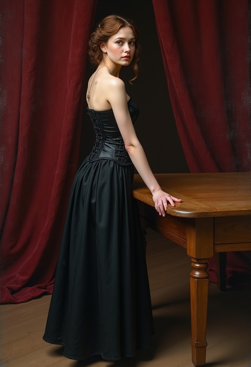 Женщина в чёрном корсете и длинной юбке стоит у массивного деревянного стола, её руки опираются на край. Текстура мазков кисти подчёркивает игру света на её плечах и рельеф поверхности стола. Позади тяжёлые бордовые драпировки, создающие эффект глубины. Крупный план, вдохновлённый полотнами Рембрандта. Картина маслом