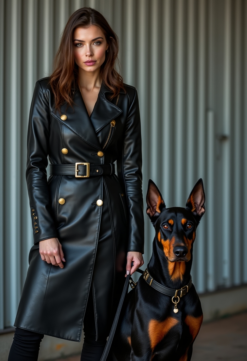 Женщина в чёрном кожаном пальто с поясом стоит рядом с доберманом, который сидит на поводке. Её взгляд направлен прямо в камеру, а руки держат поводок. Фон — индустриальная стена с металлическими панелями. Освещение контрастное, акцент на её силе и изяществе.