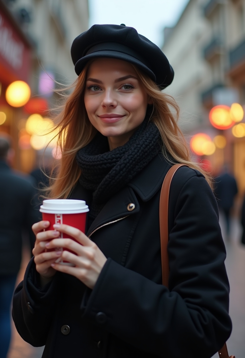 Женщина в чёрном пальто и берете идёт по Невскому проспекту, её волосы слегка растрёпаны ветром, а в руках чашка горячего кофе. Она смотрит в камеру с лёгкой улыбкой. Позади размытые огни витрин и городской транспорт. Крупный план, создающий ощущение движения мегаполиса.