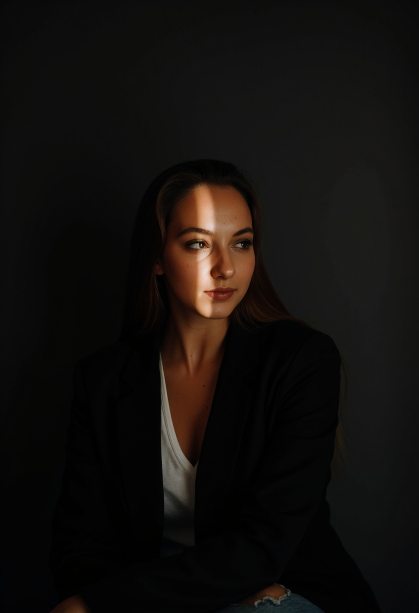 Женщина в чёрном пиджаке сидит на фоне чёрной стены, её лицо освещено двумя узкими полосами света — одна касается губ, другая скулы. Остальное пространство остаётся во мраке. Освещение точечное, подчёркивающее детали и текстуры.