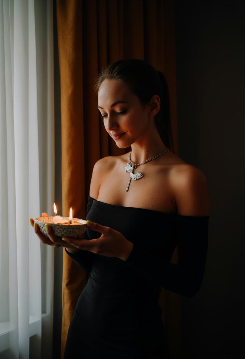 Женщина в чёрном платье с открытыми плечами и высоким разрезом стоит у окна с тяжёлыми бархатными шторами. На её шее ожерелье из серебра с изображением летучих мышей. В руках она держит канделябр с горящими свечами. Освещение приглушённое, акцент на её таинственном образе.