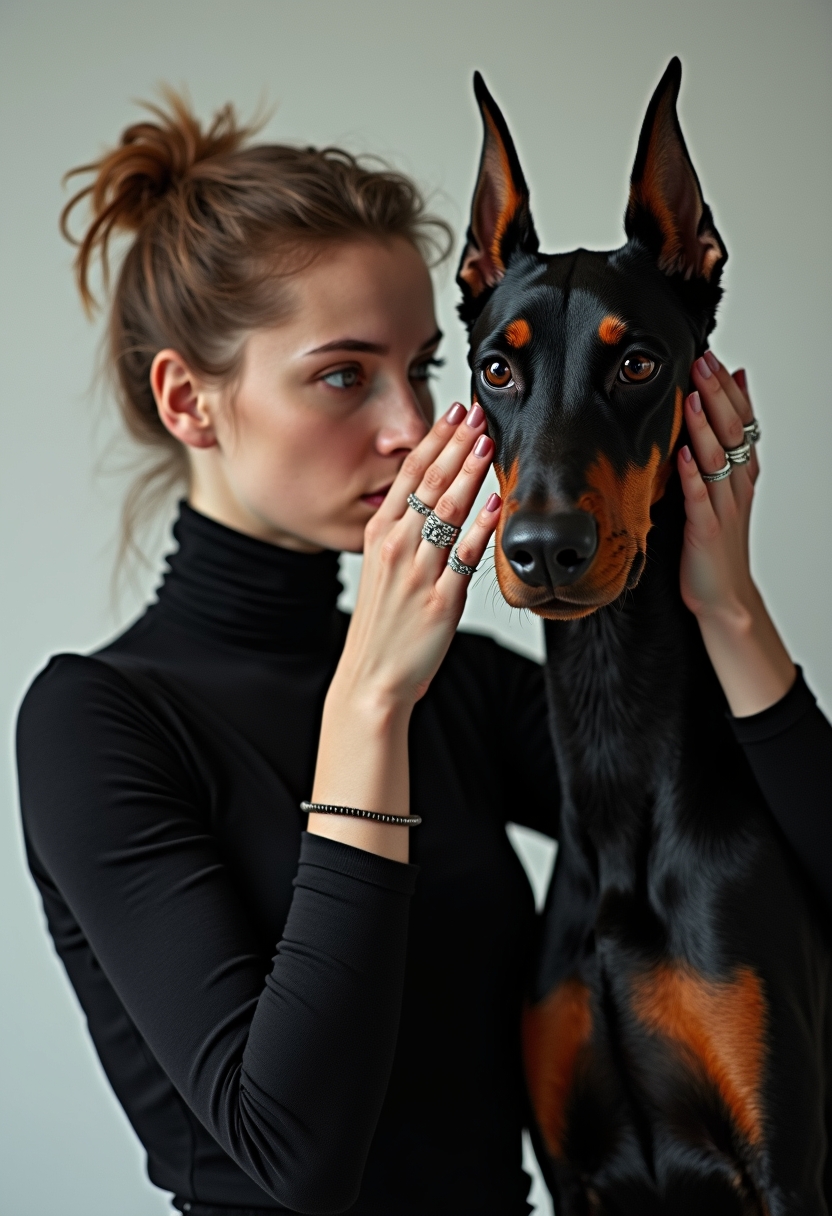 Женщина в чёрном топе с высоким воротником и массивными кольцами на пальцах держит морду добермана двумя руками. Её лицо близко к его, взгляд в камеру строгий. Доберман смотрит вперёд, его острые черты подчёркнуты мягким светом. Фон минималистичный.