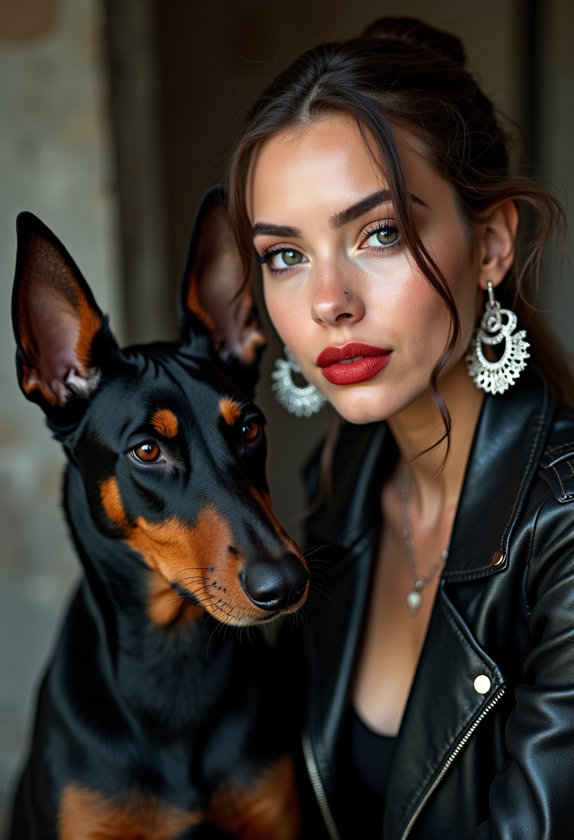 Женщина в чёрной кожаной куртке и массивных серебряных серьгах сидит рядом с доберманом. Её лицо крупным планом, взгляд уверенный, губы ярко-красного цвета. Морда добермана находится рядом, его острые уши подчёркивают дерзкий стиль. Освещение контрастное, фон размытый, индустриальный.