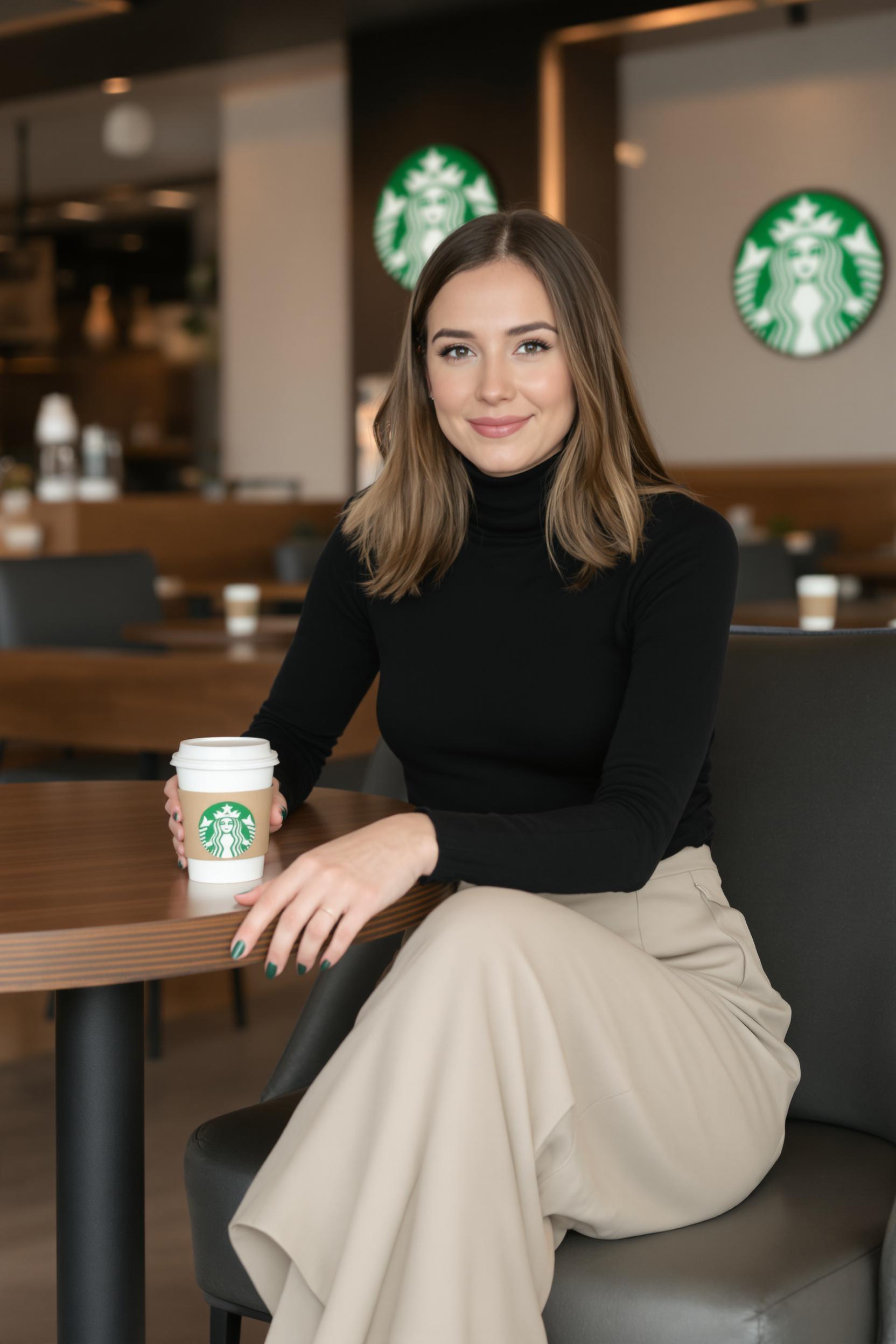 Женщина в чёрной водолазке и бежевых широких брюках сидит за столиком в Starbucks. Перед ней фирменная чашка, за спиной интерьер с зелёным логотипом и деревянными элементами. Она смотрит в камеру, улыбаясь, свет мягкий, средний план.