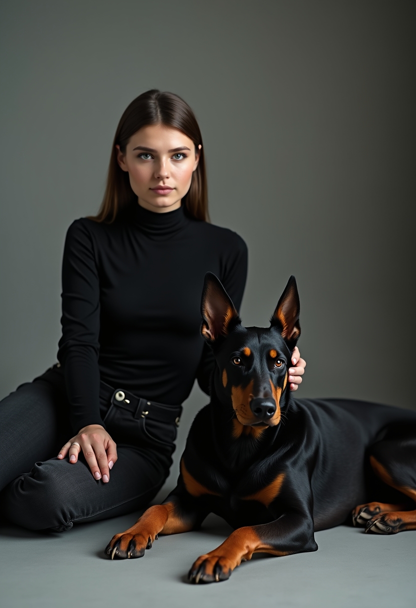 Женщина в чёрной водолазке и облегающих брюках сидит на полу рядом с доберманом, который лежит рядом, вытянувшись. Её взгляд направлен прямо в камеру, а одна рука лежит на собаке. Фон — минималистичная студия с серыми стенами. Освещение приглушённое, акцент на их взаимодействии.