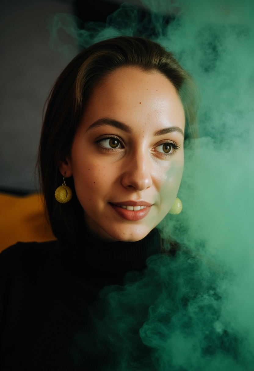 Женщина в чёрной водолазке с яркими серьгами сидит на фоне густого зелёного дыма. Её лицо крупным планом, взгляд уверенный, губы яркого оттенка. Освещение мягкое, акцент на контрасте цвета и дыма.