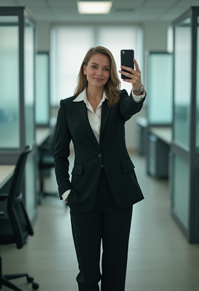 Женщина в деловом костюме делает селфи в зеркале офисного помещения, вокруг стеклянные перегородки и рабочие столы
