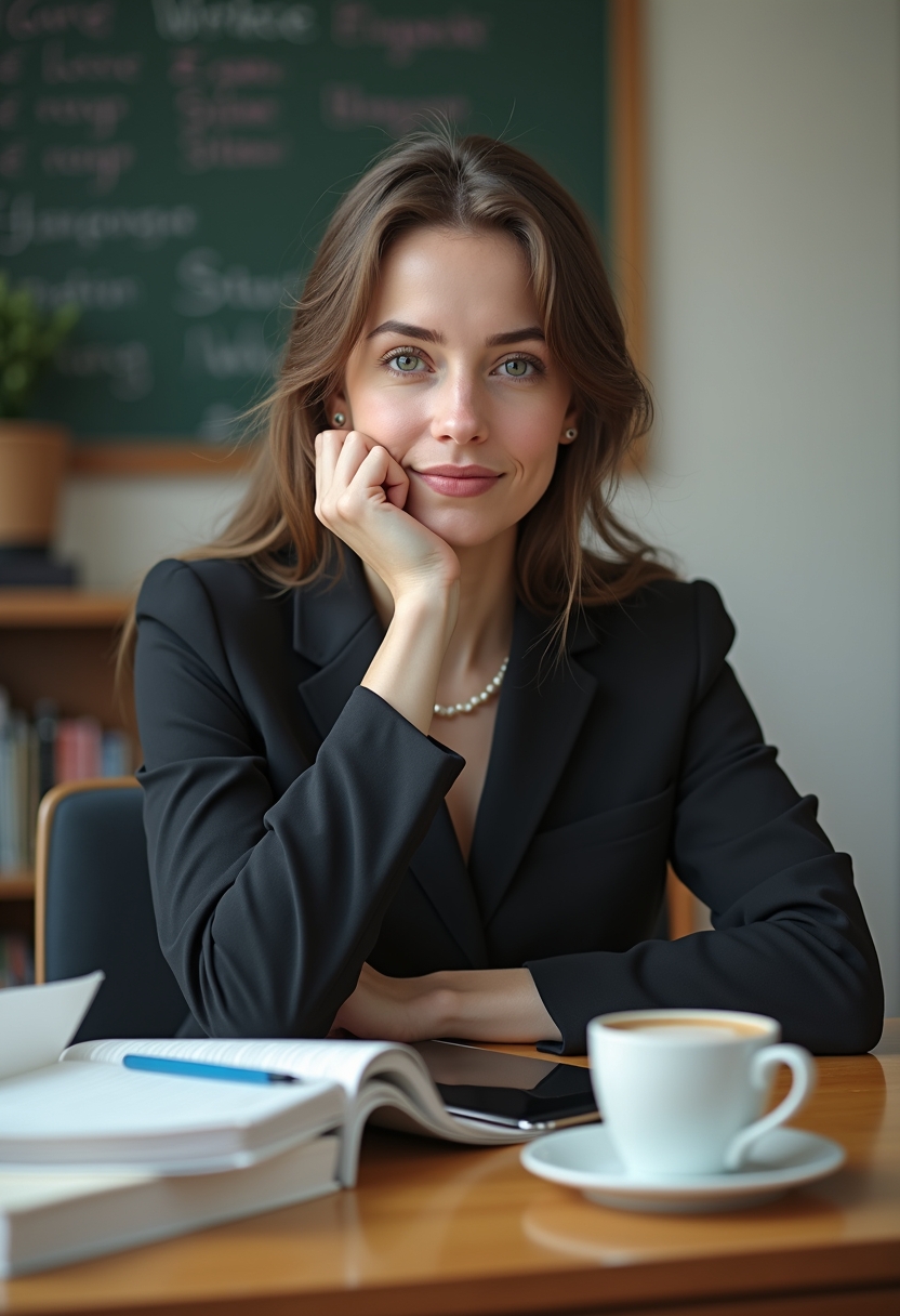 Женщина в деловом платье сидит за учительским столом, опираясь на локти и смотря в камеру. На столе — книги, планшет и чашка с кофе. Крупный план, акцент на современном подходе к профессии.