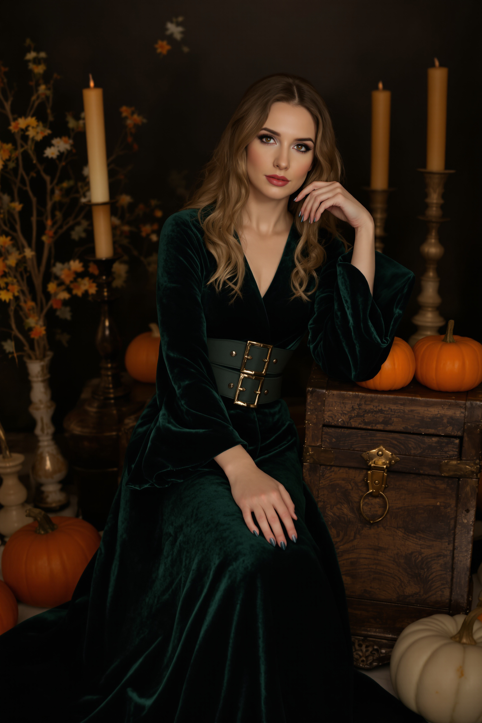 Женщина в длинном бархатном платье насыщенного изумрудного цвета с рукавами-клеш, на талии широкий пояс с серебряными пряжками. Сидит на старом деревянном сундуке среди свечей и резных тыкв, опирается локтем на колено, пристально смотрит в камеру.
