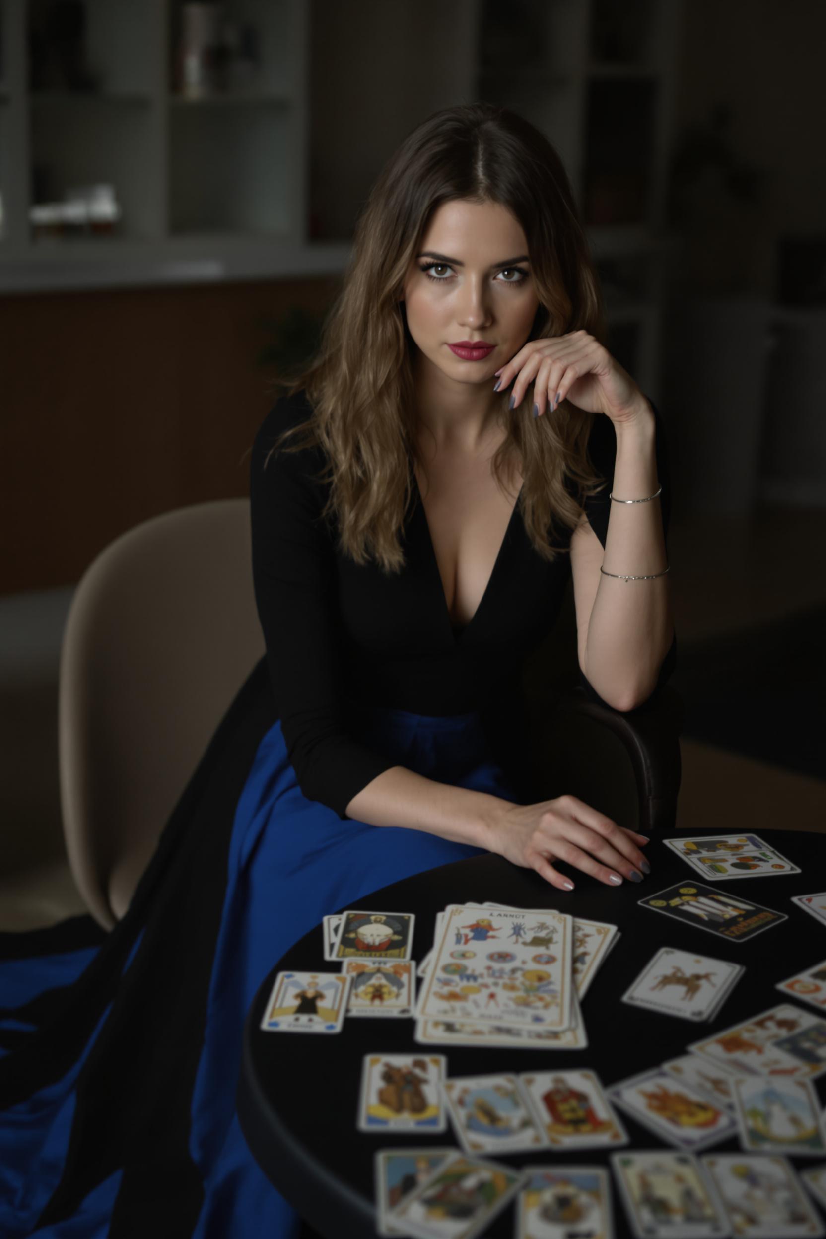 Женщина в длинном черно-синем платье с лаконичными линиями и тонким серебряным браслетом на запястье сидит за круглым минималистичным столом. Перед ней аккуратно разложены карты Таро, взгляд в камеру, спокойная мистическая атмосфера.