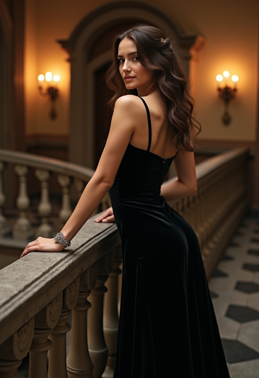Женщина в длинном чёрном бархатном платье с открытыми плечами и серебряным браслетом позирует у лестницы замка. Она смотрит в камеру с лёгкой полуулыбкой, а её рука слегка касается перил. Позади виден приглушённый свет свечей. Освещение мягкое, акцент на её лице и элегантности.