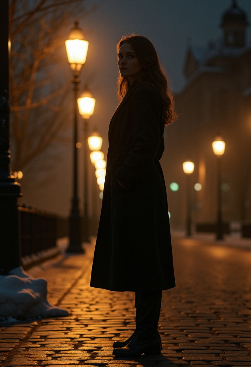 Женщина в длинном чёрном пальто и высоких сапогах стоит на пустынной мостовой, освещённой тусклым жёлтым светом старинных фонарей. Её лицо скрыто тенью, только контуры выделяются на фоне тёмного ночного неба. Освещение мягкое, акцент на пустоте и загадочности окружения.