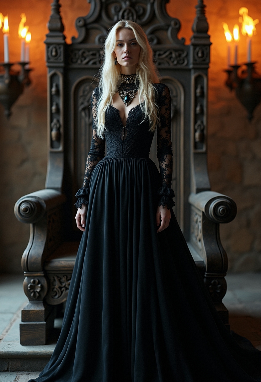 Примерить образ на себеЖенщина в длинном чёрном платье с кружевными рукавами и массивным ожерельем из чёрного оникса стоит у массивного деревянного трона с резными элементами. Позади видна каменная стена замка, украшенная факелами. Её взгляд направлен в камеру, освещение приглушённое, акцент на драматическом образе и...
