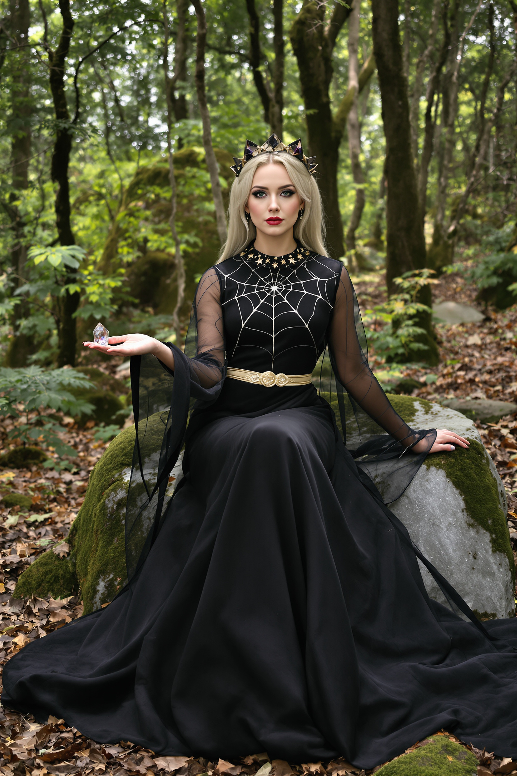 Женщина в длинном чёрном платье с рукавами-колоколами и золотым поясом, на плечах тонкая прозрачная накидка в виде паутины. Она держит мистический кристалл на вытянутой ладони, сидит на мшистом камне в лесу, взгляд устремлён в камеру, поза драматичная.
