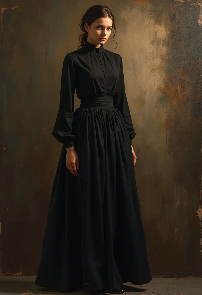 Женщина в длинном чёрном платье с высоким воротником стоит в полумраке, её лицо освещено лишь небольшим лучом света. Густые мазки передают игру теней, подчёркивая контраст между светлыми и тёмными участками. Позади приглушённые коричневатые оттенки, создающие эффект глубины, как в работах Гойи. Крупный план, акцент на драматизме сцены. Картина маслом