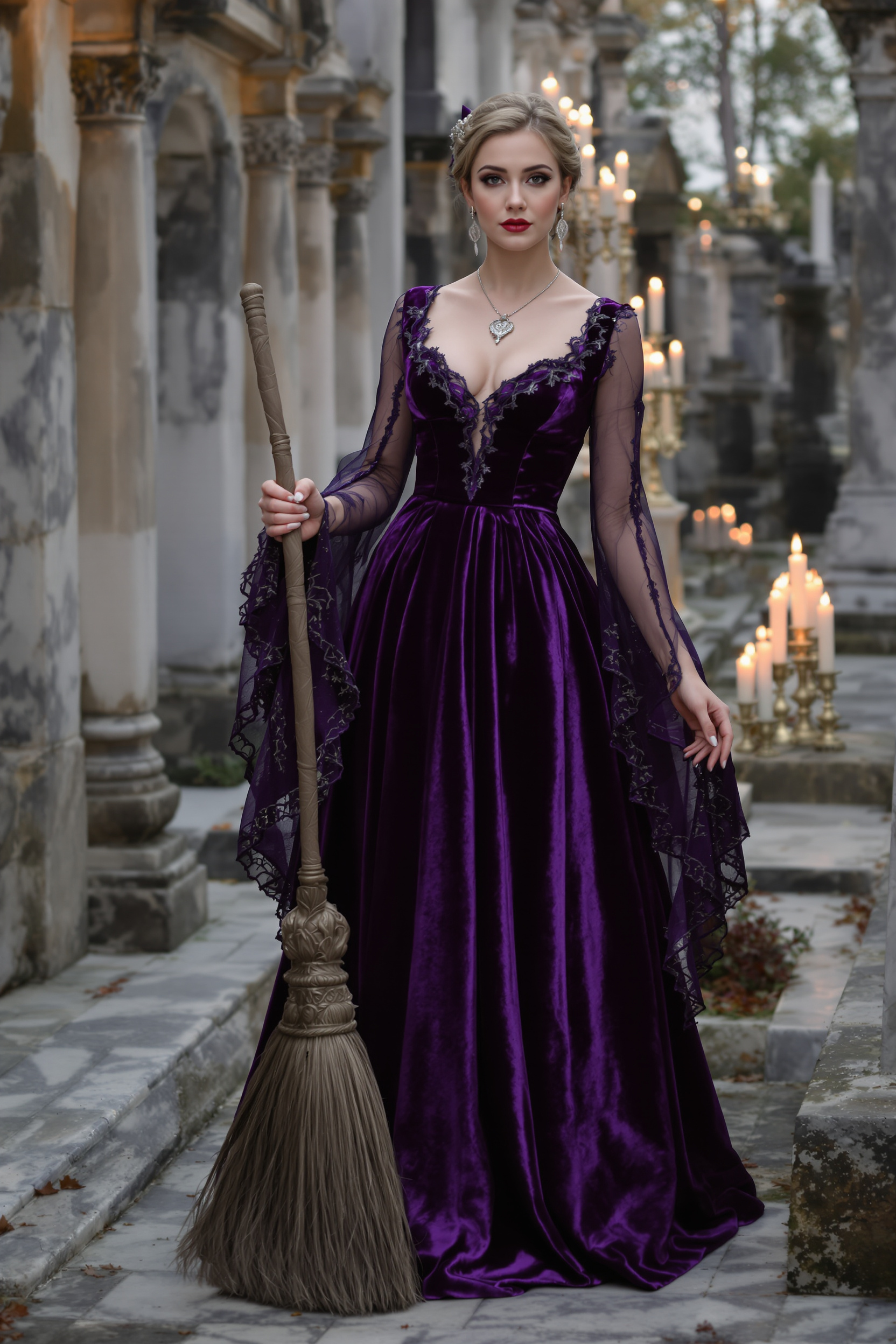 Женщина в длинном фиолетовом бархатном платье с полупрозрачными рукавами и кружевом, на шее серебряный амулет, в руке изящная метла. Вокруг мерцают свечи на мраморных плитах заброшенного кладбища. Смотрит прямо в кадр, поза задумчивая.