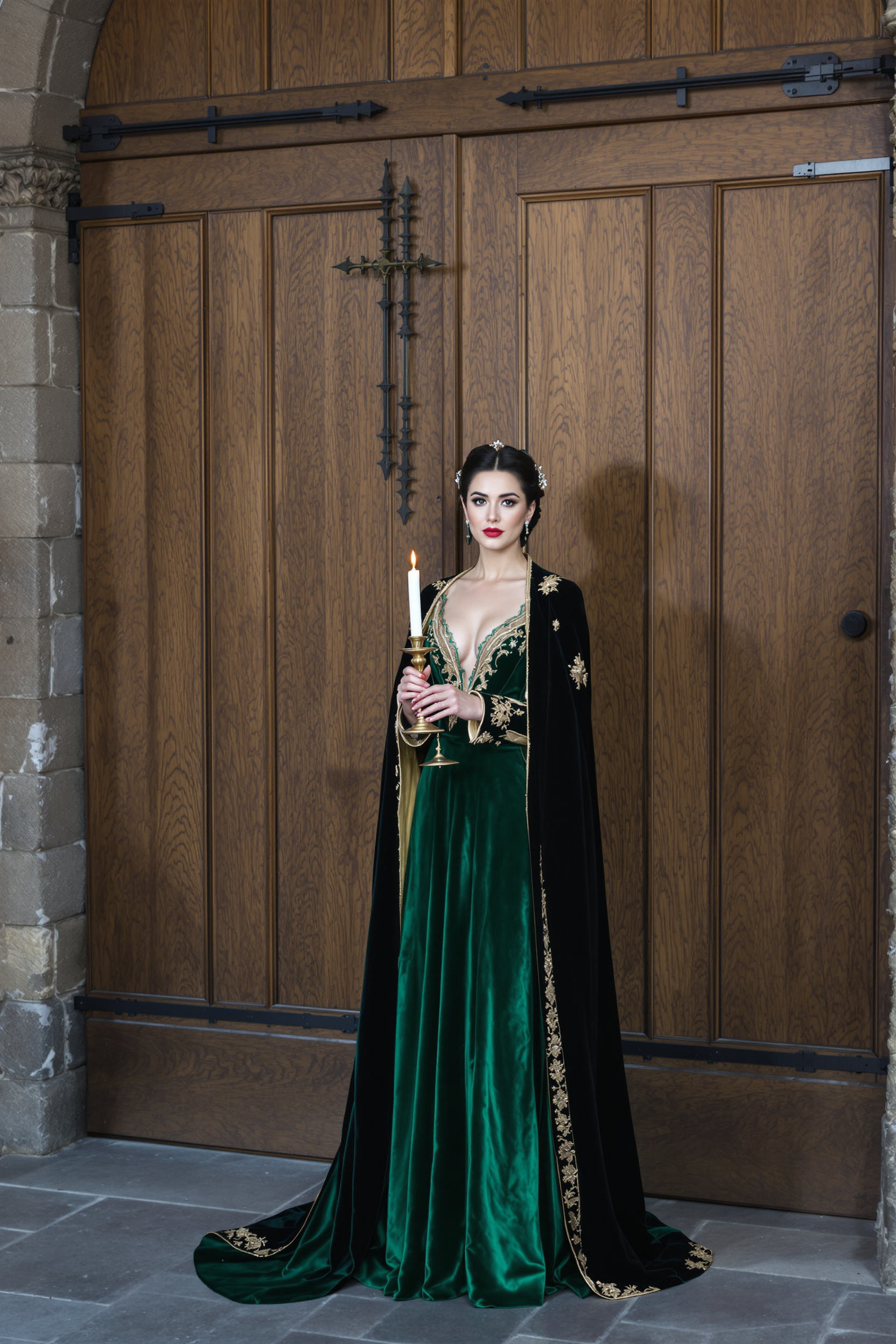 Женщина в длинном изумрудном платье с глубоким декольте и расшитыми золотом манжетами, на плечах черная бархатная накидка. Она держит в руках старинную подсвечник с горящей свечой, стоит у массивной деревянной двери древнего замка, смотрит в камеру, поза уверенная.
