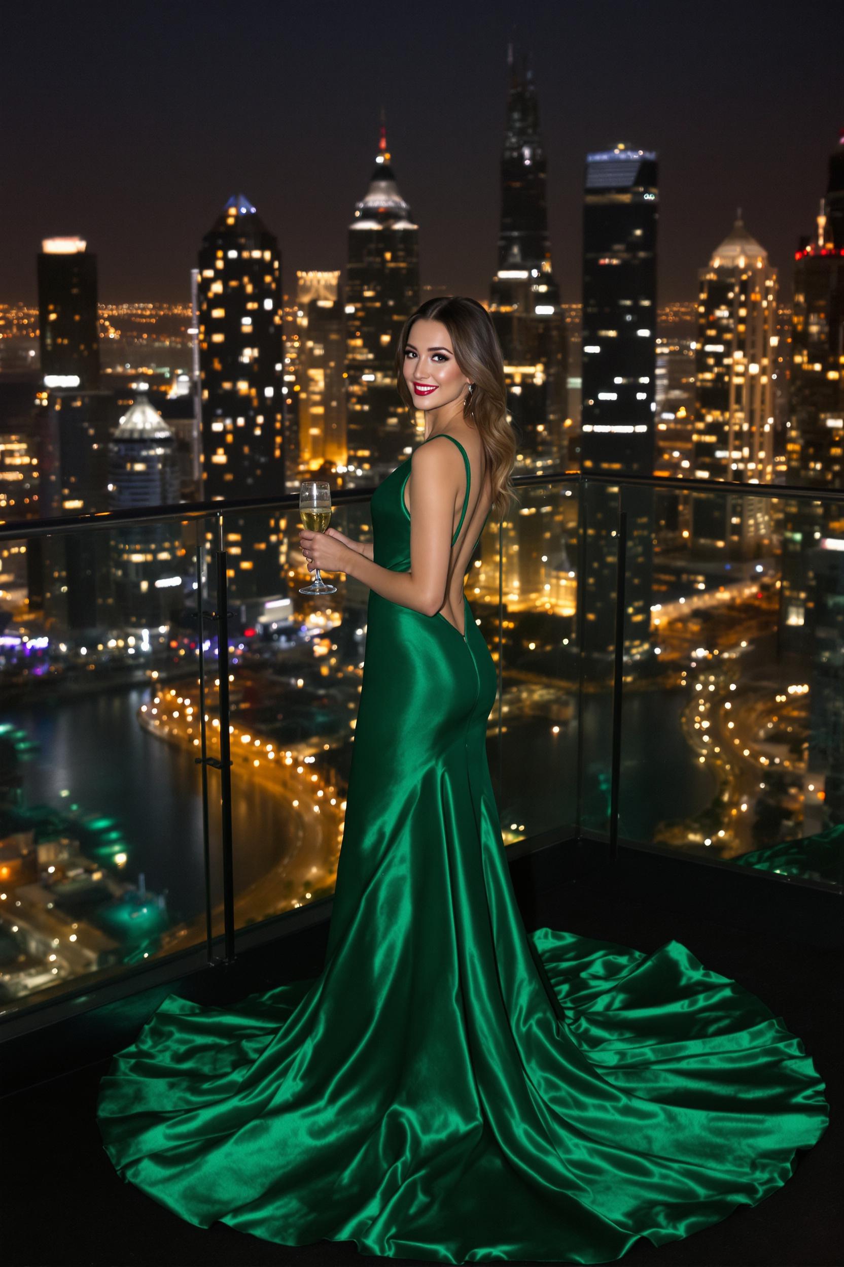Женщина в длинном изумрудном вечернем платье с открытой спиной стоит на крыше небоскрёба в Дубае ночью, вокруг мерцающие огни города и высотки, в руке бокал шампанского, она смотрит прямо в камеру, лёгкая загадочная улыбка, средний план.