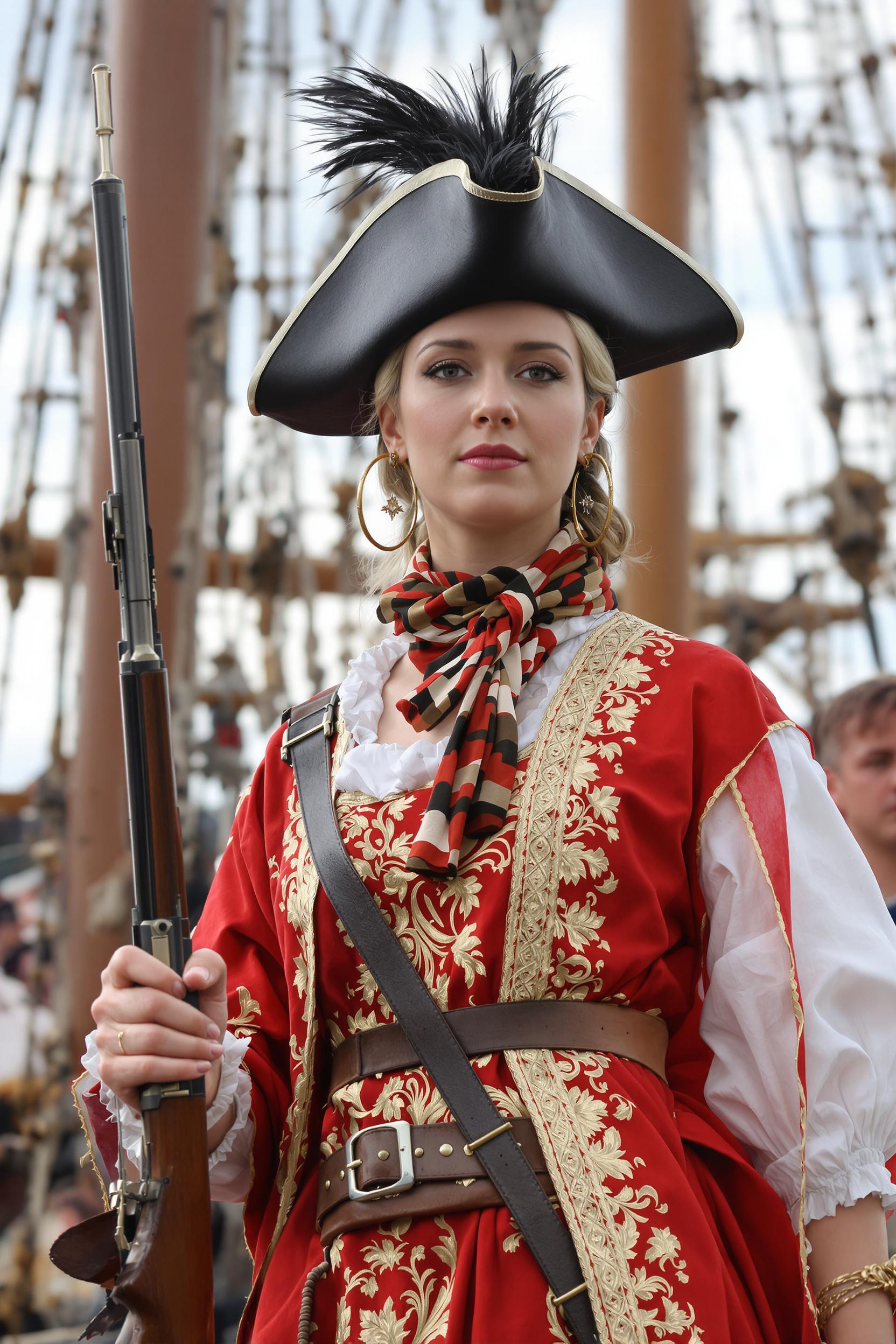 Женщина в длинном красном камзоле с золотой вышивкой и белой пышной блузе, на шее — платок, треуголка с черным пером, серьга-кольцо в ухе, кожаный ремень с пряжкой, в руке — мушкет, фон — мачты корабля, средний план, уверенный взгляд в камеру.