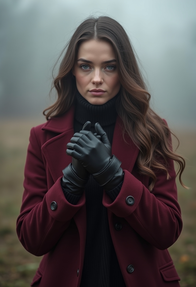 Женщина в длинном пальто цвета бордо и кожаных перчатках держит руки перед собой. Её лицо крупным планом, взгляд направлен вбок. Туман обрамляет её фигуру, создавая мягкие очертания. Освещение естественное, акцент на насыщенном цвете и дымке.