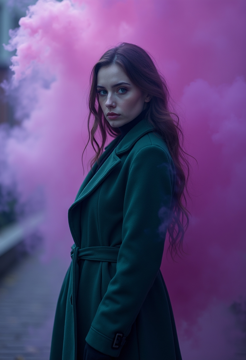Женщина в длинном пальто цвета изумруда стоит спиной к густому фиолетовому дыму. Её лицо повёрнуто к камере, взгляд строгий, черты лица слегка размыты дымом. Освещение неоновое, акцент на контрасте цвета и текстуры.