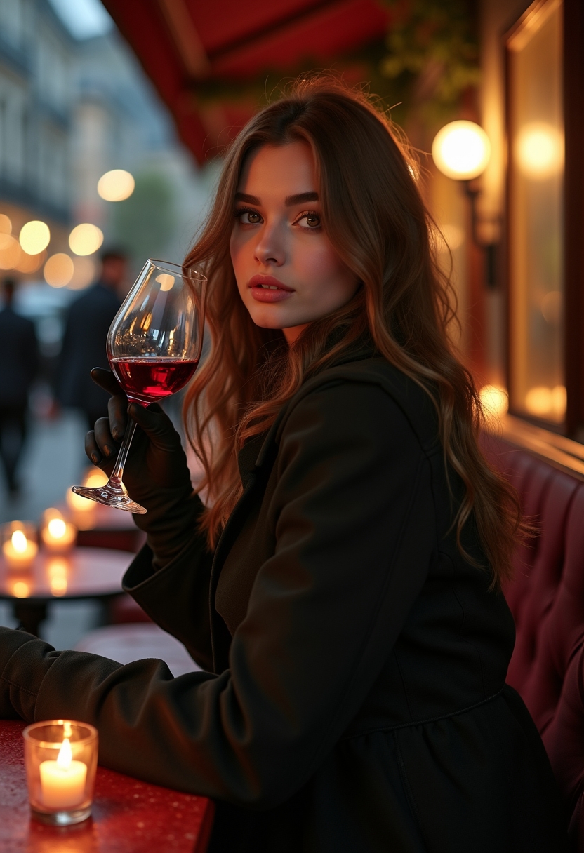 Женщина в длинном пальто и перчатках держит в руках бокал красного вина, её взгляд направлен вниз, губы слегка приоткрыты. Позади маленькое парижское бистро с горящими свечами на столиках. Крупный план, подчёркивающий интимность и утончённость момента.