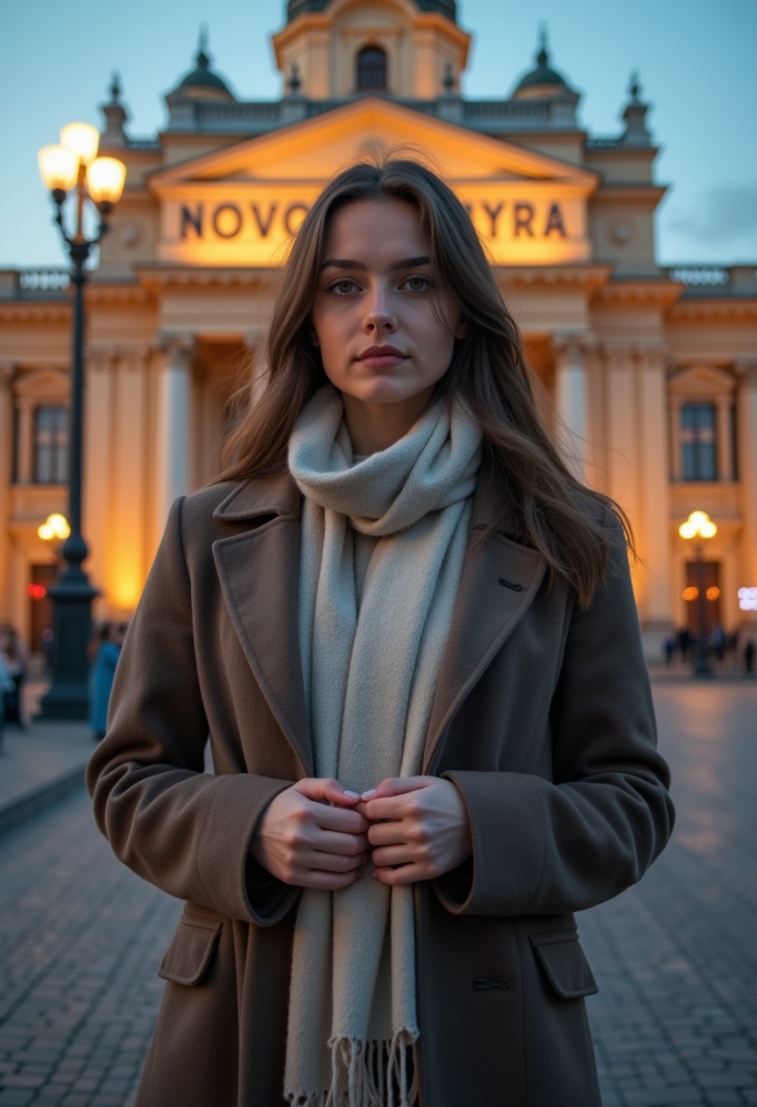 Женщина в длинном пальто и светлом шарфе стоит на фоне Новосибирского оперного театра, её руки аккуратно сложены перед собой, а взгляд направлен в камеру. Позади массивное здание театра и вечернее освещение. Крупный план, подчёркивающий элегантность и урбанистическую эстетику.