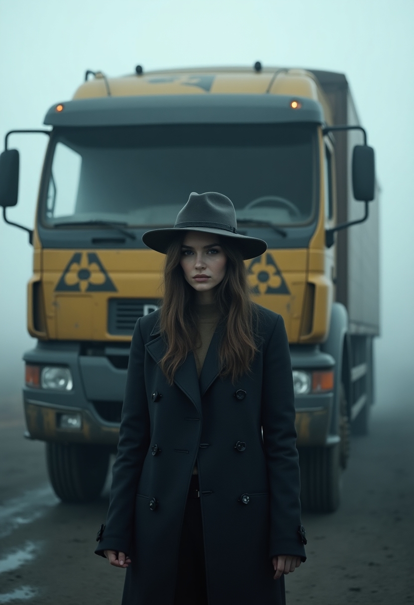 Женщина в длинном плаще и шапке стоит у разрушенного грузовика с символами радиационной опасности, вокруг густой туман, смотрит прямо в камеру