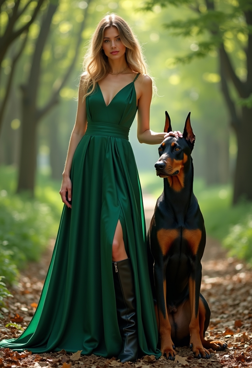 Женщина в длинном платье цвета изумруда и ботинках на высокой подошве стоит рядом с доберманом. Она слегка наклоняется к собаке, её рука лежит на голове добермана. Фон — зелёный лес с пробивающимся солнечным светом. Освещение мягкое, акцент на её утончённости.