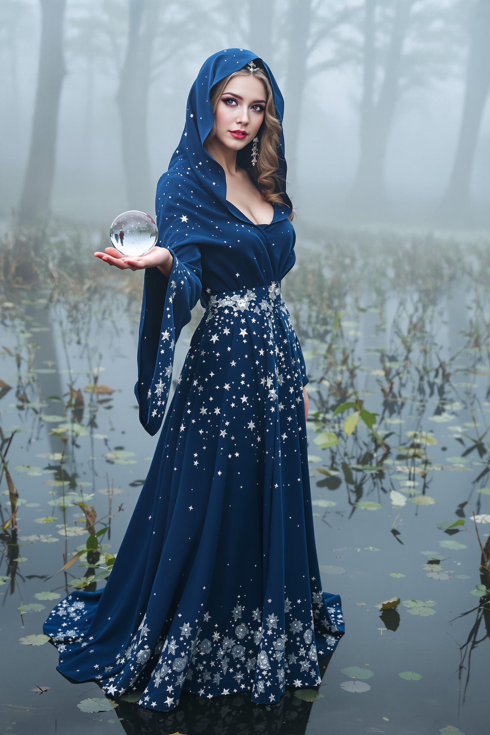 Женщина в длинном платье цвета ночного неба с глубоким капюшоном, по подолу мерцающие вышивки-звёзды. Стоит посреди туманного болота, в руках держит стеклянный шар, балансирует его на ладони, взгляд прямо в камеру, поза загадочная.
