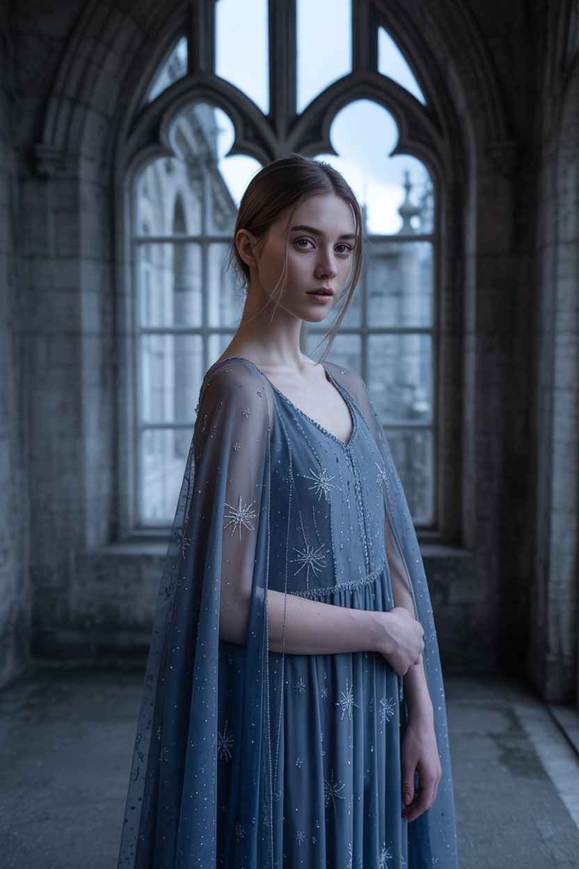 Женщина в длинном платье цвета ночного неба с вышивкой серебряными звёздами стоит у готического окна замка. Она смотрит прямо в камеру, её руки опущены вдоль тела. На плечах полупрозрачная накидка с легким мерцанием. Позади арочные проёмы, мягкое лунное освещение.