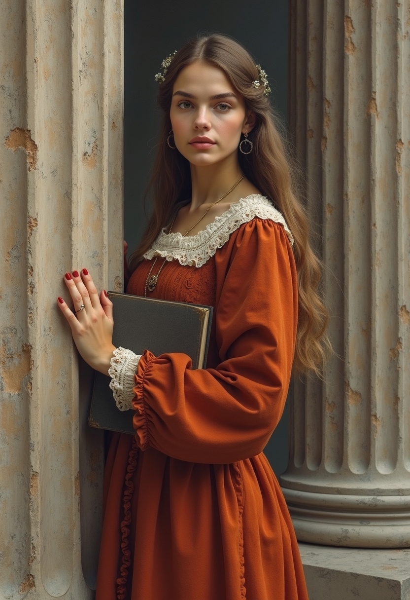 Женщина в длинном платье эпохи Ренессанса стоит у массивной колонны, её рука держит книгу, а взгляд направлен в камеру. Широкие мазки кисти подчёркивают текстуру камня и мягкость ткани. Позади приглушённые тона, создающие ощущение старинной живописи. Крупный план, акцент на деталях лица и...